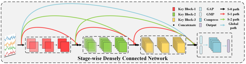 油气田井口的参数测量对整个开采过程及后续的运输、加工过程都有重要的指导意义,精确的参数测量可以提高生产效率,加快生产进度。为提高井口环境下流动参数测量的精度,高忠科教授团队构建了分阶段密集连接网络(Stage-wise densely connected network,SDCN)对含气率和总流速进行了测量,构建的网络结构如图1所示。在四扇区电导传感器采集的两相流信号基础上,对网络模型进行了分阶段的训练。通过关键卷积模块提取信号的深层次特征,并使用便捷连接完成特征的重复利用,最终通过输出模块完成信息汇总优化,在含气率和总流速的参数测量上分别将相对误差降低到了5.5%和2.1%。