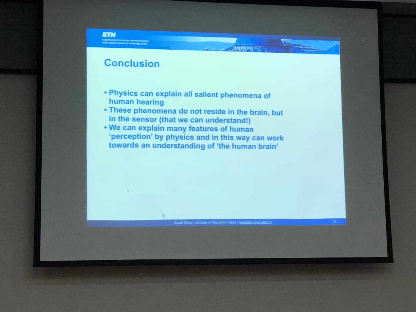 在报告的最后,Ruedi Stoop教授对报告进行了总结:物理学可以解释人类听力的所有显着现象,这些现象不存在于大脑中,而是存在于传感器中,我们可以通过物理学来解释人类感知的许多特征,从而可以对“人类大脑”有所了解。