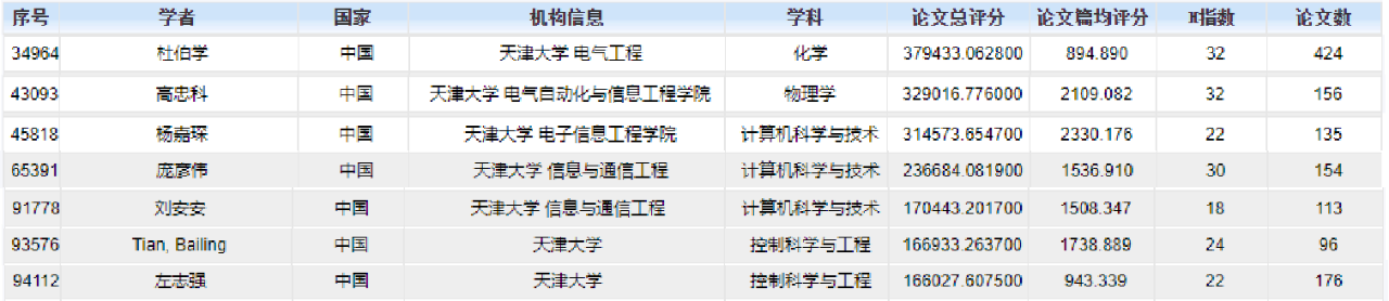 近日,全球学者库公布了“全球顶尖前10万科学家” 排名,该榜单涵盖多个领域及其子学科,严格依照学者科研产出、Google Scholar Metrics 期刊评分、H指数、成果被引、成果中作者排序位置等多项参数进行综合评价并产生最终结果。在排名统计过程中,始终秉持开放的原则,所有数据来源均真实可靠,排名不受任何外界环境和经济因素所影响。平均分高表明学者更倾向于在高质量期刊发表文献,综合评分则更多考虑学者的产出量。我院杜伯学教授、高忠科教授、杨嘉琛教授、庞彦伟教授、刘安安教授、田栢苓教授、左志强教授入选排名榜单,论文数分别位列第11677位、55653位、63709位、56495位、73041位、80298位、49125位,论文总评分分别位列第34964位、43093位、45818位、65391位、91778位、93576位、94112位。该名单中,国内入围科学家共11642人,仅次于美国(38449人),位居第二,其中天津大学入围121人。