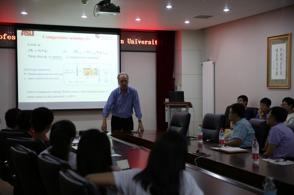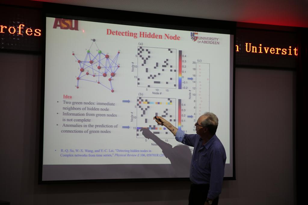 在报告中,Celso Grebogi院士围绕其最近研究工作,着重介绍了压缩感知理论及其在复杂网络动力学研究中的应用,并以复杂动力学网络重构和预测为例阐述压缩感知和复杂网络研究中的前沿方向及其挑战。报告最后,Celso Grebogi院士同与会师生就复杂网络与非线性动力学系统重构等问题进行了深入的交流和讨论。通过此次学术交流活动,进一步推动了自动化学院在复杂网络与压缩感知方面的学术研究。