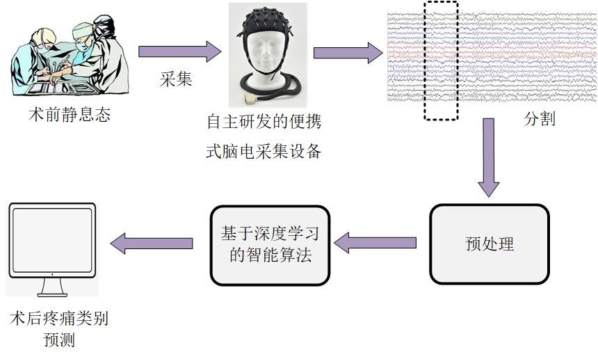 疼痛是一种常见病,按疼痛持续时间和性质,疼痛可分为急性疼痛和慢性疼痛。急性疼痛指短期存在、通常发生于伤害性刺激之后的疼痛,急性疼痛如果在初始阶段未得到完全控制,可能会发展为慢性疼痛。长期的慢性疼痛会导致大脑神经系统发生异常变化,严重影响患者的生活质量。头皮脑电信号是客观评价疼痛疾病的重要途径,对患者术前静息态脑电信号的研究分析能够为急性疼痛与慢性疼痛的分类提供重要依据。针对此问题,高忠科教授团队设计了一套基于脑机接口和深度学习的术后急性疼痛预测系统。如下图1所示,该系统基于自主研发的便携式脑电采集设备在术前0-3天获取病人的术前静息态脑电信号,利用滑动窗口技术对脑电信号进行分割得到一系列的滑动窗口数据,利用预处理方法将一系列的滑动窗口数据转化为二维图像,利用提出的基于深度学习的智能算法进行计算分析,得到脑电信号所属类别并在显示器上输出分类结果,实现医疗过程中的术后急性疼痛预测。团队基于26名临床病人的术前静息态脑电信号使用该系统中的处理分析算法进行计算,得到了94%的预测准确率,验证了该系统的有效性。