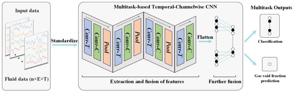 在油气田开采过程中,井口环境下含水率的测量对油气的开采及后续运输、加工等过程都有重要意义,准确的含水率测量可以更精确地掌握油气田开采过程的变化。因此,高忠科教授团队模拟井口开采环境,进行了两相流实验,通过四扇区传感器采集流体信号,并根据流体信号的空间特征以及时域变化,设计了多任务时间通道卷积网络(Multitask-based temporal-channelwise convolutional neural network,MTCCNN),该网络结构如图1所示,通过关键卷积模块提取信号的时间、通道特征,并通过全连接层进行组合筛选,并进一步地优化多任务输出模块,使得在含水率测量的相对误差低至2.43%